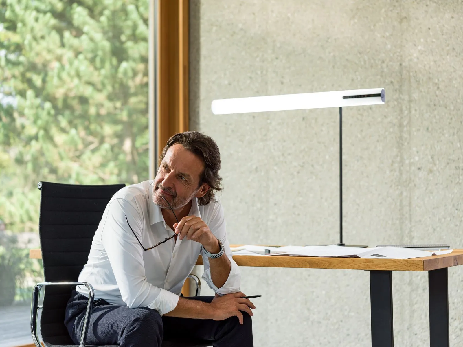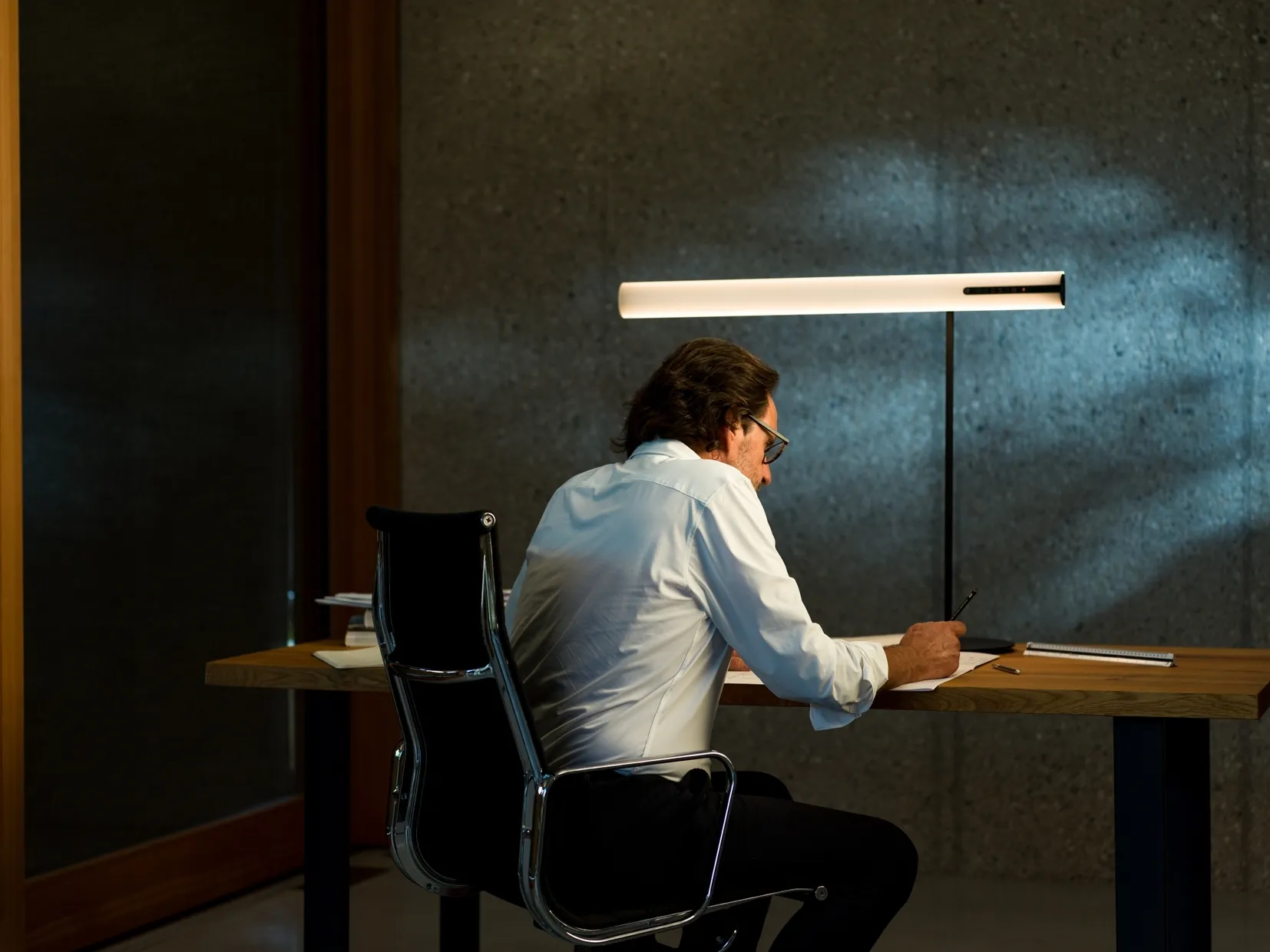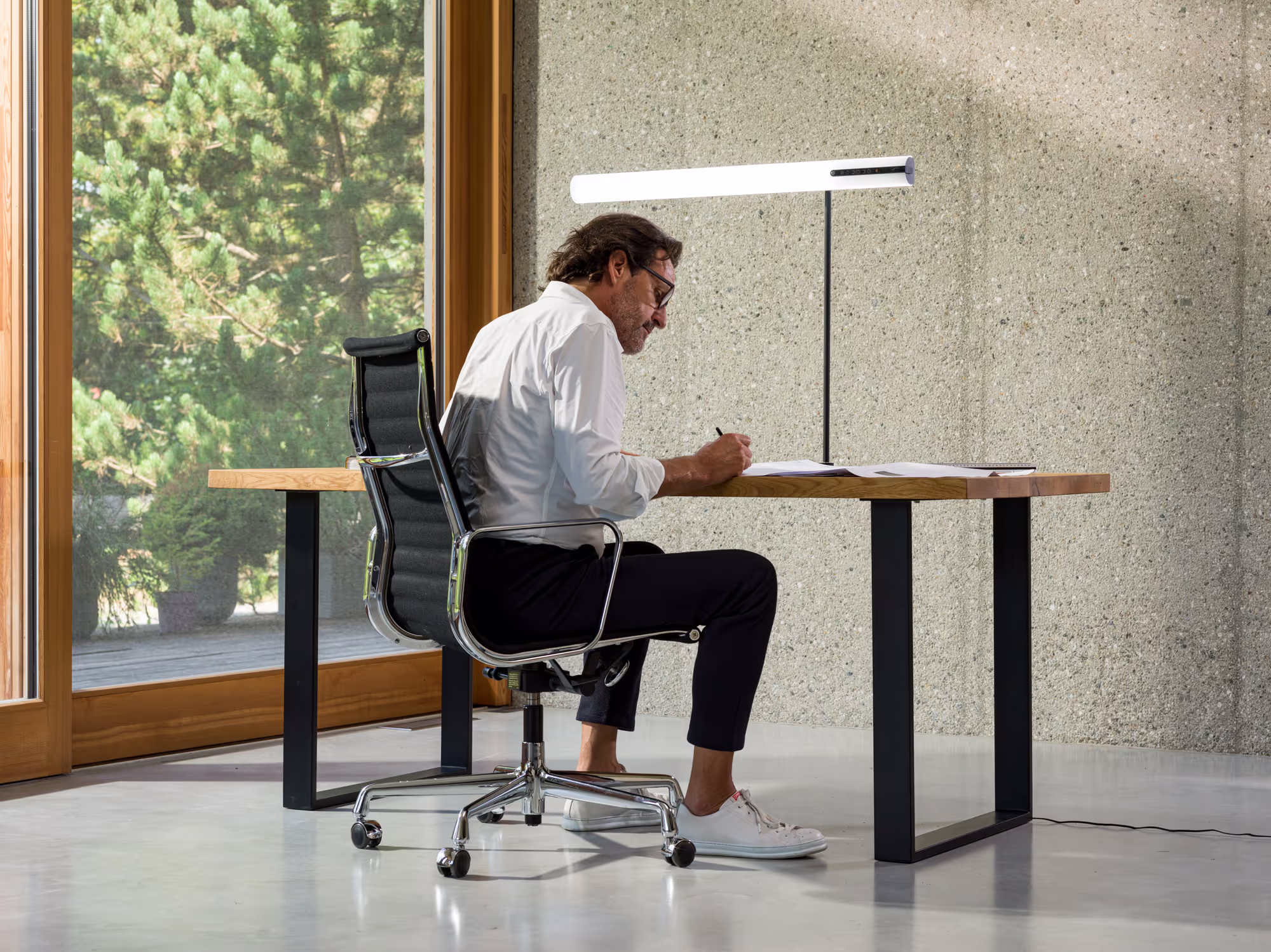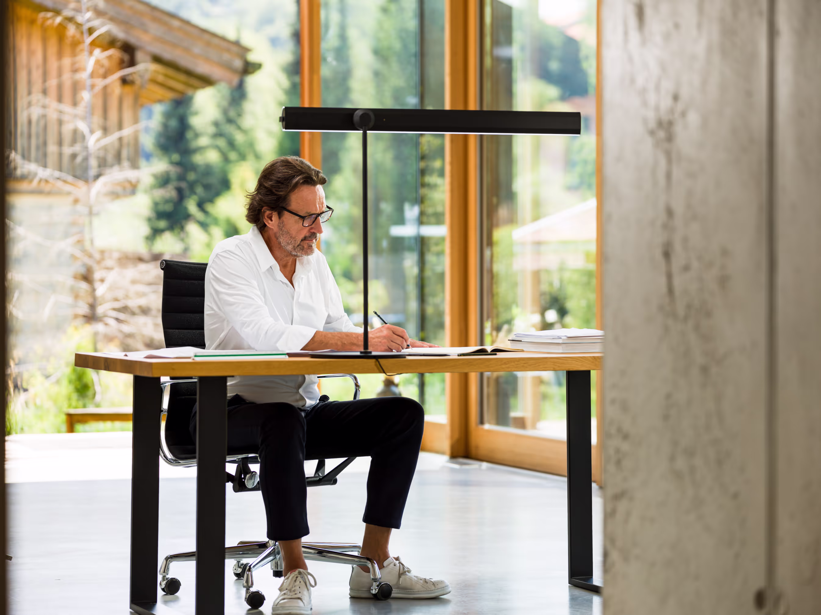 The downward desk illumination provides wide-area illumination with linear, shadow-free light. For effortless work with documents or on the monitor.